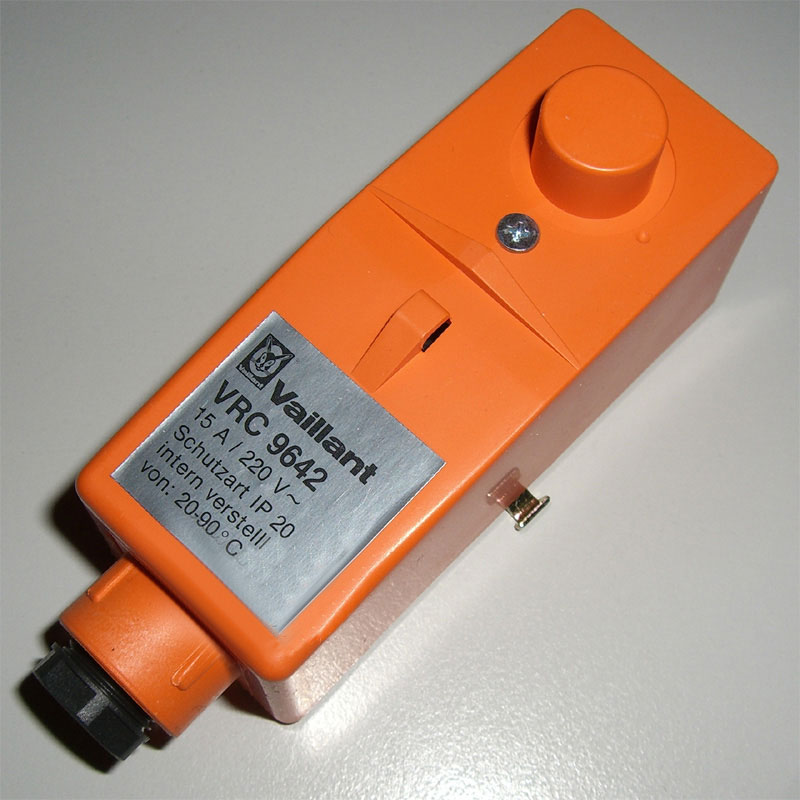 VRC 9642 накладной термостат, контактный с переключающим контактом. Крепление на трубе при помощи пружинного хомутика. Диапазон установки - +10° - +90°. Постоянная зона нечувствительности - 5 К. Мощность на контактах - 230 В, 15 А.