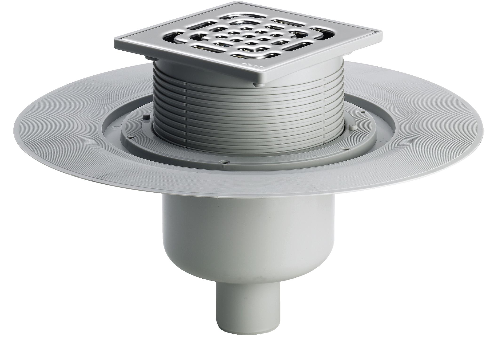 Фронтальная поверхность для нанесения/закрепления гидроизоляции, поворотная и регулируемая по высоте насадка 150x150 мм, заглушка, поверхность для установки решетки сделана из пластика, штампованная решетка из нержавеющей стали 1.4301, съемный гидрозатвор.
